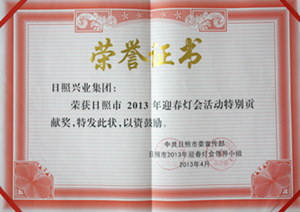 2013年4月,興業(yè)集團榮獲“日照市2013年迎春燈會活動特別貢獻獎”
